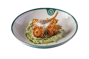ארטישוק מטוגן מוגש על מצע לאבנה פסטו, פרמז'ן ושמן ירוק