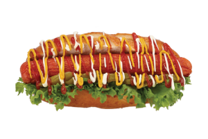 נקניקיית עוף מוגשת בלחמניית בריוש , חסה לליק , מלפפון חמוץ , עגבניה ורטבים מעל