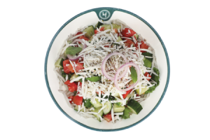 מלפפונים חתוכים גס, עגבניות, בצל סגול, נענע, קרוטונים, גבינה בולגרית, זיתים שחורים, לימון שמן זית, זעתר וסומק מוגש על מצע חסה.