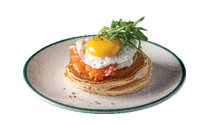 2 יח' פנקייק, גבינת שמנת, ביצת עין, סלמון מעושן, עלי רוקט ופרמז'ן