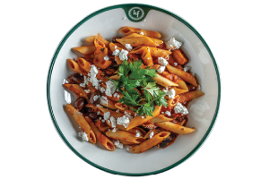פנה סיציליאנה פסטה פנה ברוטב עגבניות, שום וחצילים מטוגנים, גבינת פטה, זיתי קלמטה, פלפל קלוי ופטרוזיליה