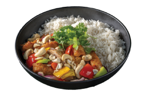 צ’יקן קונג קוביות חזה עוף בטמפורה פריכה מוקפצות בירקות וטריאקי, מוגש ליד אורז מאודה, פטרוזיליה, אננס וקשיו מעל