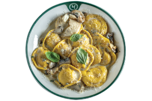 רביולי גבינות רביולי במילוי מבחר גבינות מוגש עם אורגנו, בזיליקום ורוטב לבחירה: רוזה / עגבניות / שמנת / שמנת פטריות
