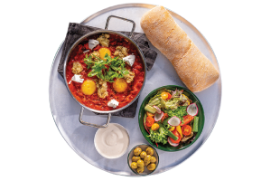 שקשוקה גלילית מוגשת במחבת חמה עם 3 ביצים, רוטב עגבניות, עשבי תיבול, עלים ירוקים, מטבל טחינה, זיתים, לחם וסלט קטן בצד לבחירה.